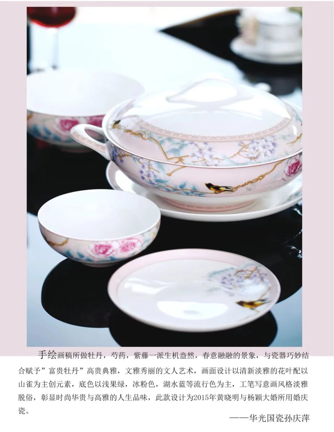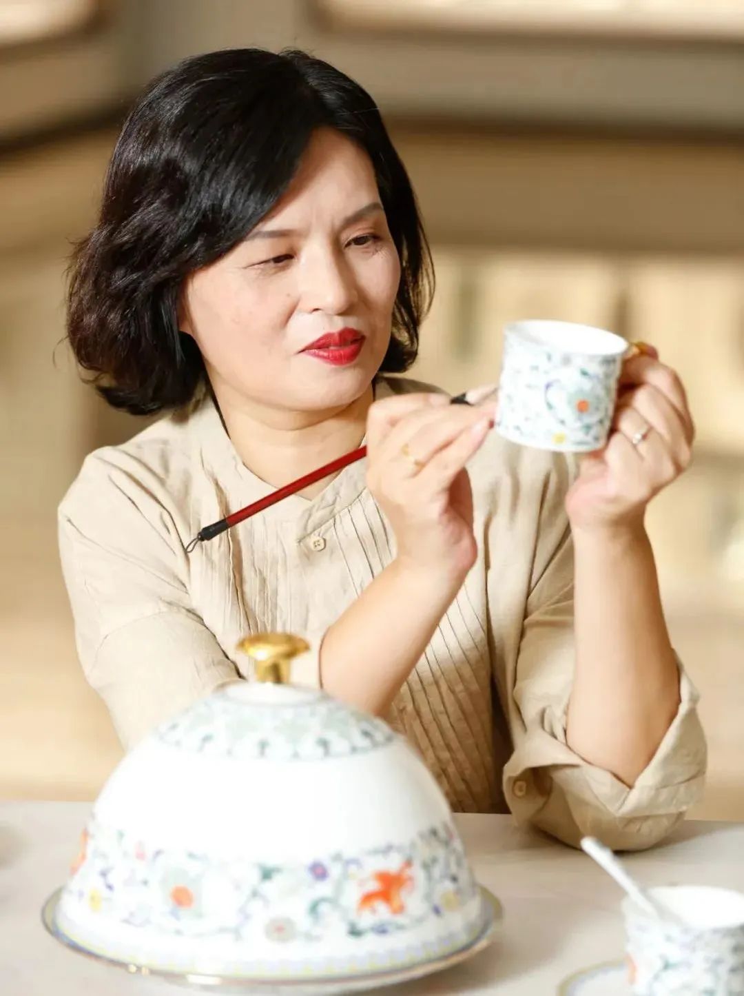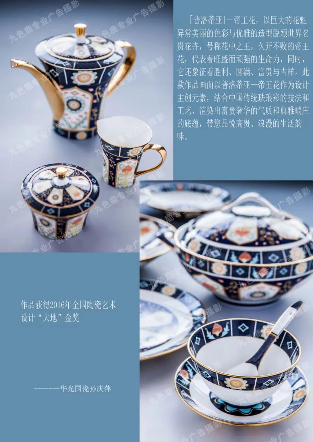 孙庆萍倾心研究日用陶瓷艺术与装饰设计30年,秉承“传承国粹 播撒清新”的设计理念,结合古典文化探索现代审美,在日用陶瓷画面设计方面形成高雅大气、华丽尊贵的艺术风格。创造作品精益求精,为寻找最适合的作品颜色,她曾耗时一年多在无数次土与火的煅烧中淬炼出 “普罗蒂亚蓝”,其高贵典雅的色彩席卷了当时的整个欧洲市场。