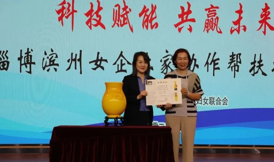 会上,淄博市女企业家协会向滨州市女企业家创业创新协会赠送刻有“科技创新 共赢未来”字样的琉璃樽,寓意两地女企业家从此携手“走在前”、共同“开新局”,祝福两地女企协之间的感情更加深厚、友谊更加绵长。两市协会常务副会长杨淑琴、李茜上台交接。