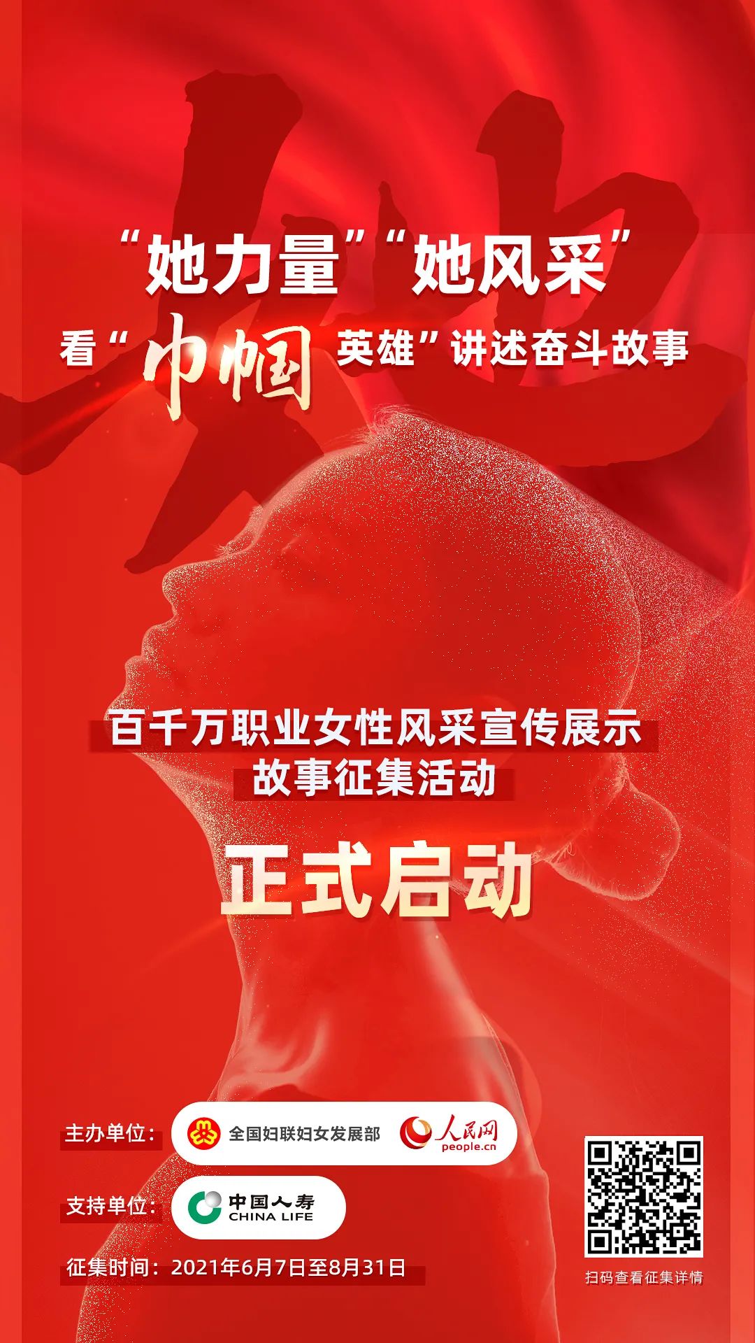 当前,征集报名仍在进行中,报名截止时间为8月31日。同时,“百千万职业女性风采宣传展示”专题页面也已正式上线,在“人民网+”客户端和人民网进行集中展示。来这里,一起发现更多身边的“她力量”,共同为“她风采”点赞助力!