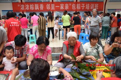 为弘扬中华民族的传统美德,在端午节来临之际,淄川区将军路街道邀请巾帼志愿者在颐泽社区举办了“浓浓粽飘香 邻里一家亲”包粽子培训班,包括辖区内的老人、孩子等有近百名群众参与了活动。