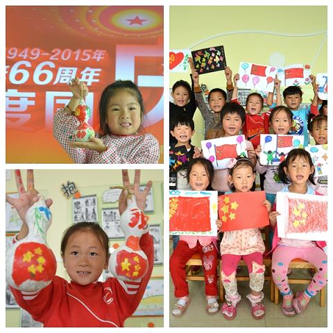 连日来,东里镇幼儿园开设特色课堂,喜迎华诞66周年。图为小朋友们展示他们制作的葫芦彩绘、儿童主题画和剪纸国旗等作品。