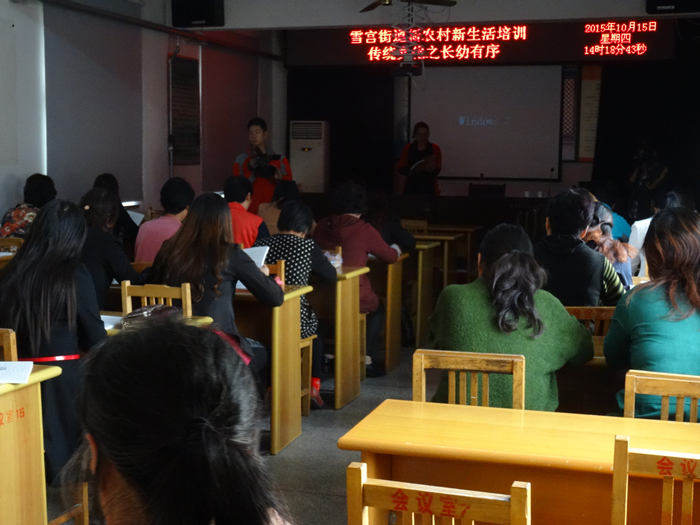 在今年的新农村新生活培训中,临淄区雪宫街道妇联突出抓好传统文化的学习,邀请孔子礼仪文化学校―临淄分校的专家前来授课,内容包括《论语》、《弟子规》、《大学》、《家和之道》、《做智慧女人》等,目的是通过长期坚持不懈的组织妇女学习,使妇女群众的道德进一步提升,心灵进一步净化,通过妇女半边天的带动作用,形成辖区尚礼明德的浓厚氛围,促进家庭和谐、社会和谐。
