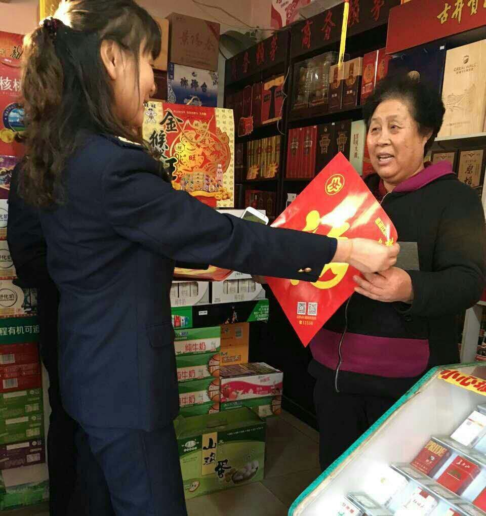 为更好地宣传《反家庭暴力法》,临近春节前夕,周村区工商局妇委会结合业务工作,组织女职工到航东中心路、正阳路部分区域,为辖区内的经营业户送上大红“福”字,广泛宣传《反家庭暴力法》的有关内容和依法经营相关政策,受到了经营业户的普遍欢迎。
