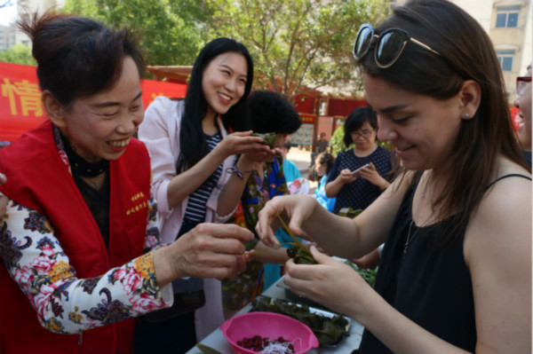“五月五,过端午,点艾叶,挂柳枝,香草荷包五彩绳。”来自淄博职业学院的俄罗斯、哈萨克斯坦等13国留学生代表在张店区迎春苑社区度过了一个温馨的端午节。围绕“粽情飘香四海传 袅袅京韵五洲扬”中外文化交流主题,社区设置“慧讲民俗”、“巧手包粽”、“玩转国粹”、舞台表演、“翰林染墨”等环节,为传统民俗活动注入国际化的元素,呈现了中外文化碰撞融合的氛围。