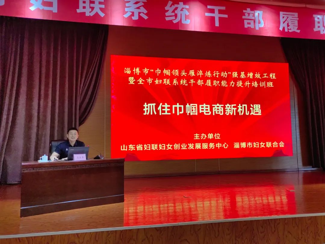 山东商业职业技术学院乡村振兴产业学院电子商务专业负责人马立金老师讲授《抓住巾帼电商新机遇》,重点讲解了如何借助短视频和直播途径进行电商项目实施,为学员普及电商的相关知识和技能。