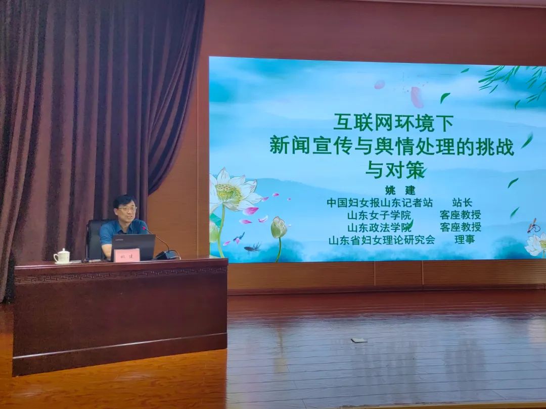 中国妇女报山东记者站站长姚建讲授《互联网环境下妇联新闻宣传的挑战与对策》,告诉学员如何运用发散思维、逆向思维,练就一双“新闻眼”。