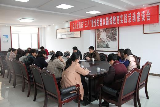 为隆重庆祝三八妇女节,3月7日下午,周村区人社局妇委会召开了庆三八暨群众路线教育实践活动女干部座谈会。局党委书记、局长马明峰同志,局党委副书记、副局长宋海清同志以及全系统各单位的14名女同志代表参加座谈。
