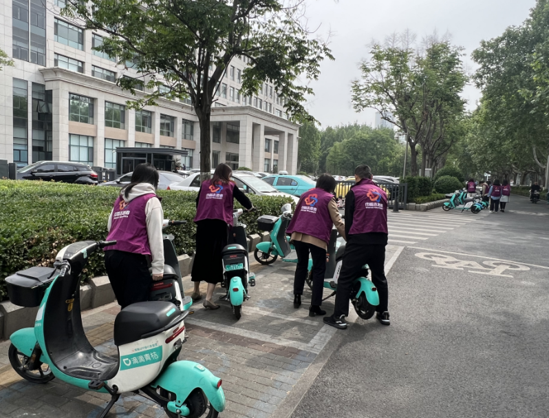 在步行街,大家将路边停放的共享电动车摆放整齐,向路边的商户、过往的群众发放文明旅游倡议书,宣传文明旅游知识,号召大家从自身做起,真正把文明行为记在心间、落在实处,共同维护淄博的良好形象。