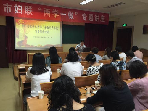 为了更好地把握中央和省市委关于“两学一做”学习教育的部署要求,加深对党章党规、习近平总书记重要讲话的理解,着力增强做合格党员的思想自觉、行动自觉,6月27日,市妇联机关党总支邀请了淄博市委党校、淄博行政学院党的建设教研部讲师李鑫作《学习习近平总书记“全面从严治党”重要思想论述》专题讲座,机关及下属事业单位50余名党员及入党积极分子一同参加了学习。