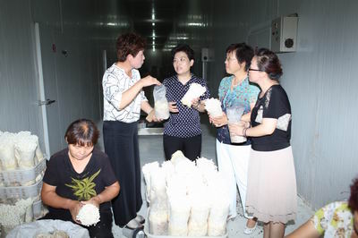 邢主席在益君发展有限公司察看金针菇种植技术,了解贫困妇女就业情况