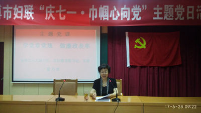 6月28日,市妇联举行“庆七一 巾帼心向党”专题党日活动,全体党员重温入党宣誓,市人大常委会副主任、市妇联主席翟乃翠同志以《学党章党规,做廉政表率》为题为机关党员干部上党课。