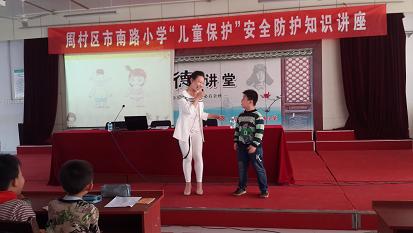4月23日下午,周村区妇联组织“儿童保护”志愿者走进市南路小学,为本校四年级级部的全体学生共200余人开设了一堂“儿童保护”安全防护知识课程。