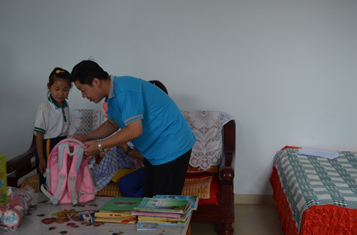 站在新的书桌旁,毕玉孔小朋友背上了爱心书包,接过了叔叔阿姨送来的儿童食品。