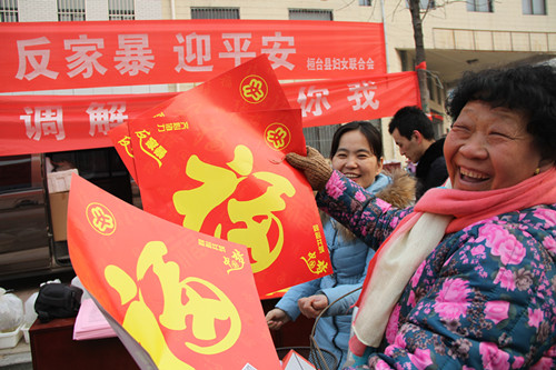 1月21日,桓台县妇联维权工作人员走进唐山镇大集,走近妇女,开展了以“拒绝家庭暴力,共促平安和谐”为主题的“送福字 反家暴 迎平安”送新春福字宣传活动。活动当天,共送出福字1000余张、月历牌300余份、《反家庭暴力亮点解读》500余份、妇女小额担保贷款政策明白纸500余份等。妇联维权工作人员为群众讲解了《反家庭暴力法》等法律法规知识,呼吁群众主动参与到反家庭暴力活动中来,为构建平安和谐桓台贡献一份力量。工作人员还指导妇女们通过扫微信的方式关注省、市妇联微信公众号,不断扩大妇联工作的宣传面。其它镇(街道)妇联也积极以各种形式参与到反家庭暴力送新春福字宣传活动中来,反家暴宣传在全县全面铺开。(桓台县妇联)