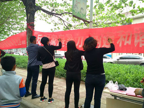 近日,桓台县妇联全体党员干部走进西苑社区开展了《反家庭暴力法》宣传活动。工作人员向社区居民发放了《反家庭暴力法》宣传彩页,并向过往的居民发出“不要家庭暴力,好好爱”的倡议,引导居民们在“拒绝家庭暴力,共建美好家园”条幅上签名,作出承诺。社区居民积极响应工作人员的号召,纷纷在条幅上签名作出承诺,活动取得良好效果。(桓台县妇联 陈晋娟 )