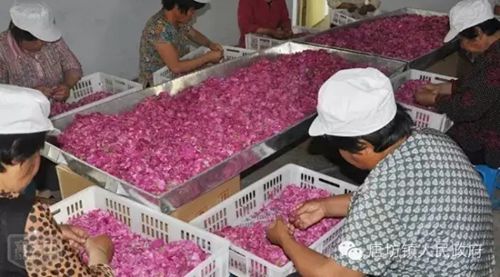 几十名妇女正趁着清晨水露充沛好时机抢摘玫瑰花。每日盛开的玫瑰花必须在露水干前采摘才能保持花的鲜度,玫瑰花盛开旺季时每天都必须组织几十人采摘。这些妇女都是附近的村民。玫瑰花从5月开始采摘,可采到9月,每天用工量20人次左右,一年用工量达1500人次,带动附近村100余名妇女实现增收。据盈汇玫瑰园负责人介绍,玫瑰花除可以观赏,制成玫瑰茶、玫瑰酱、玫瑰蜜等产品,市场前景十分广阔。