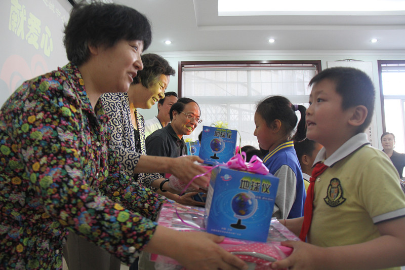 孩子们拿到新书包、新文具、地球仪等节日礼物时露出了天真灿烂的笑脸,纷纷表示要更加努力用心地读书学习,不辜负叔叔阿姨的期望。