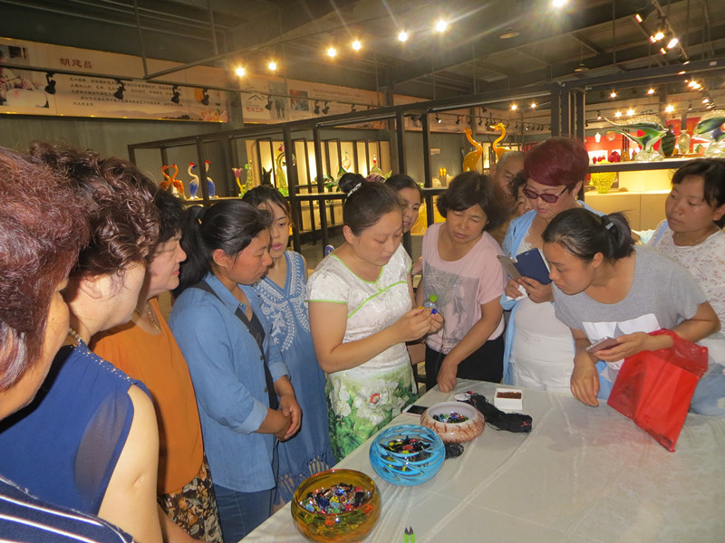 本期培训班由博山区妇联统筹安排,50多名贫困妇女参加了培训。培训班首先由西冶工坊的李志刚总经理向大家介绍了西冶工坊的发展历程和琉璃工艺的传承,随后学员们现场培训学习了穿帘子、编织结扣、参观吹灯等各种实用技能。本次培训班区妇联特别邀请了原博山美术琉璃厂副厂长孙慧和原原博山美术琉璃厂高级技师扈美丽为大家讲授结扣编织技术。