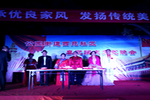 9月28日晚,公园街道妇联在西苑社区开展了“传承优良家风 发扬传统美德”为主题的喜迎国庆文艺晚会。晚会现场邀请了三对患难与共的老夫妻共庆金婚银婚,他们的家庭和谐、互敬互爱、幸福安乐的美好生活,感染了在场的每一个人。