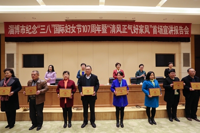 会上,表彰了2016年度淄博市最美家庭,成立了市“清风正气好家风”宣讲团。市最美家庭、宣讲团成员代表亓艳红、白雪燕、王秋菊分别讲述了她们热心公益、传播文化、孝老爱亲的感人故事,充分展现出我市妇女和家庭崇德向善的精神状态和乐观进取的生活态度。