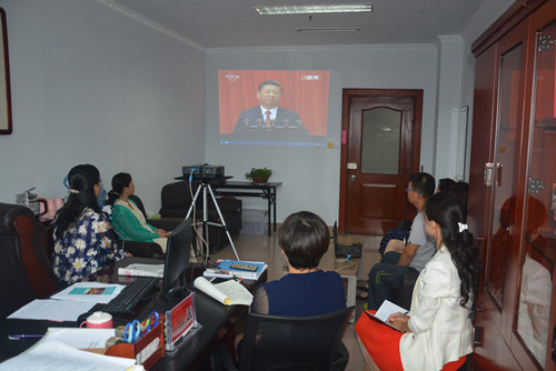 8月1日上午10时,庆祝中国人民解放军建军90周年大会在人民大会堂举行,习近平总书记出席大会并发表重要讲话,区妇联主席苑坤带领机关全体干部观看了实况直播。大家认真看,仔细记,十分专注。