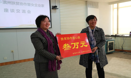 会议现场,淄博市妇联副主席崔云芝介绍了这次座谈会的主要目的是深化交流,加强合作,进一步巩固和提升两市妇联扶贫协作关系。淄博市与滨州市的友好合作关系由来已久。崔主席还介绍了淄博妇联在实施巾帼脱贫行动、妇女创业创新培训、贫困妇女健康扶贫等助力脱贫攻坚方面的经验做法。淄博市妇联向滨州市妇联捐赠了3万元爱心款,用于帮扶滨州市建档立卡贫困妇女儿童、扶持大姐工坊,带动更多的贫困妇女脱贫致富。郑玉梅主席对淄博妇联一行的到来表示热烈的欢迎和衷心的感谢。李云主席主持座谈会并介绍了滨州市妇联实施巾帼脱贫行动以来所做的工作。两市的女企业家们现场进行交流座谈,就合作项目达成了初步意向。