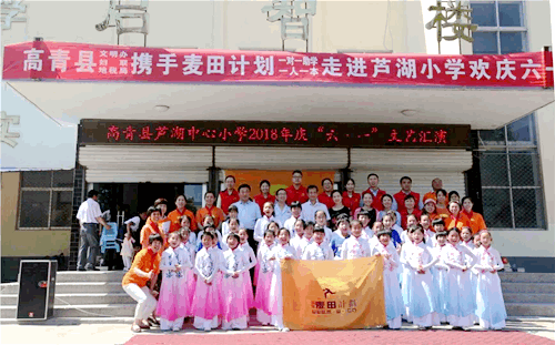 高青县妇联、文明办、地税局携手麦田计划走进芦湖小学开展欢庆六一主题活动。活动通过少先队入队仪式、救助金发放、书籍捐赠、庆六一文艺汇演的方式,关爱儿童的童年,让拥抱新时代、牢记新要求、学习好榜样、争做好队员的理念走进校园、社区和基层。