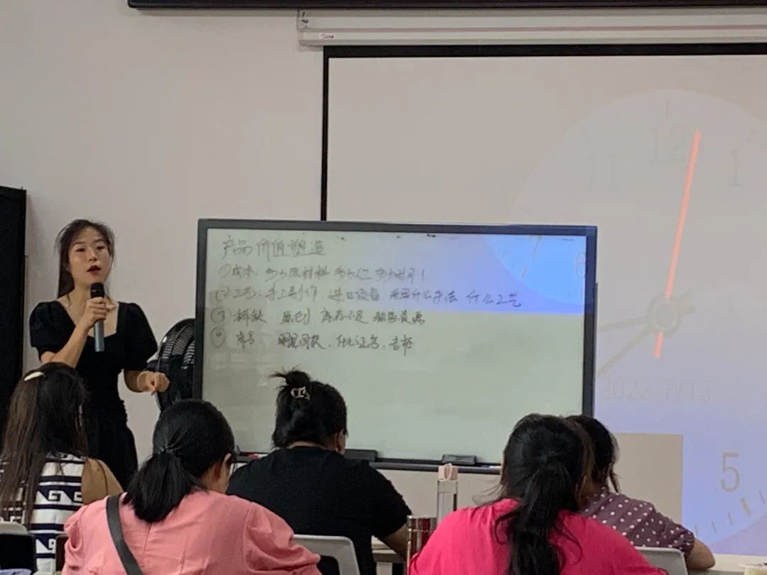 培训中,两位讲师分别从直播实操角度和直播运营角度,针对学员们实际需求,通过授课、讨论、互动等方式,从基本的达人帐户开通、实名认证以及如何开通橱窗,如何选品、养号等基本性设置,到主播的着装要求及基本素养,到话术的框架,以及如何选品、排品、过品、玩法等现在直播间常用的策略和方法,让大家在今后的直播中少走弯路,做好所有平台要求数据,让大家快速成为一个运营型主播,干货满满。