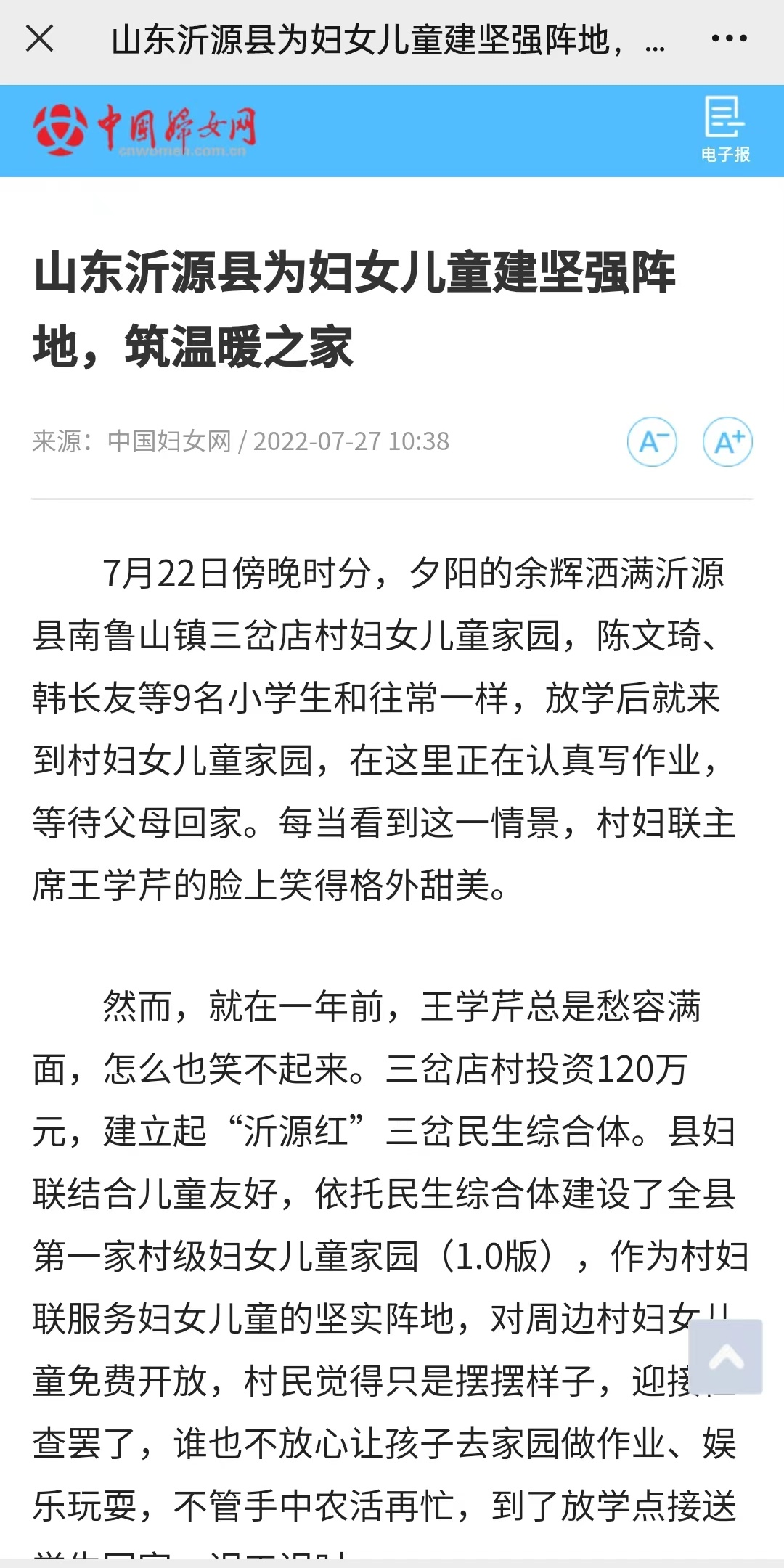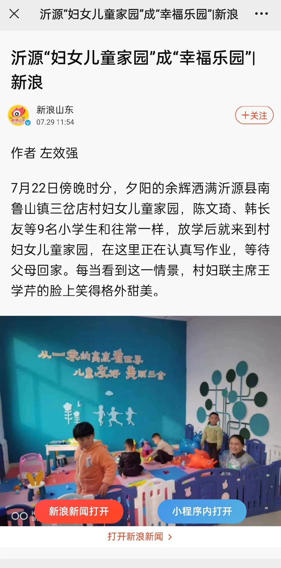 去年以来,沂源县妇联坚持眼光向下,服务向上,在农村叫响“以一米高度看沂源”的儿童友好理念,依托幸福家园民生综合体建设2.0版村级妇女儿童家园24处,实行“1+1+N”模式(1个民生综合体+1个妇女儿童家园+N项服务),充分发挥“妇女儿童家园+”融合效应,聚力打造农村妇女儿童的“温暖之家”“关爱之家”“服务之家”“维权之家”“活动之家”, 为农村妇女儿童和家庭提供特色化、专业化、精准化的亲情服务,让村里孩子享受到城里孩子一样的友好发展环境,为高品质民生建设助力添彩。