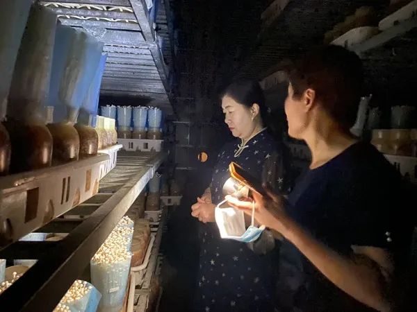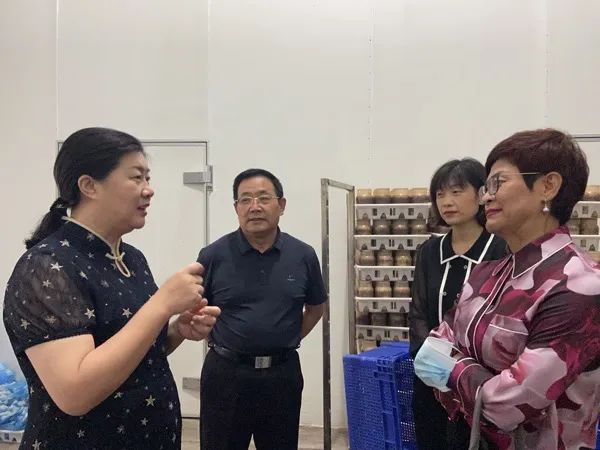在博山区石马镇益君农业股份有限公司,王旭副主席一行到菇棚内实地参观金针菇栽培工艺,并与致富女带头人王庆华就扩大金针菇种植规模遇到的困难进行交流。