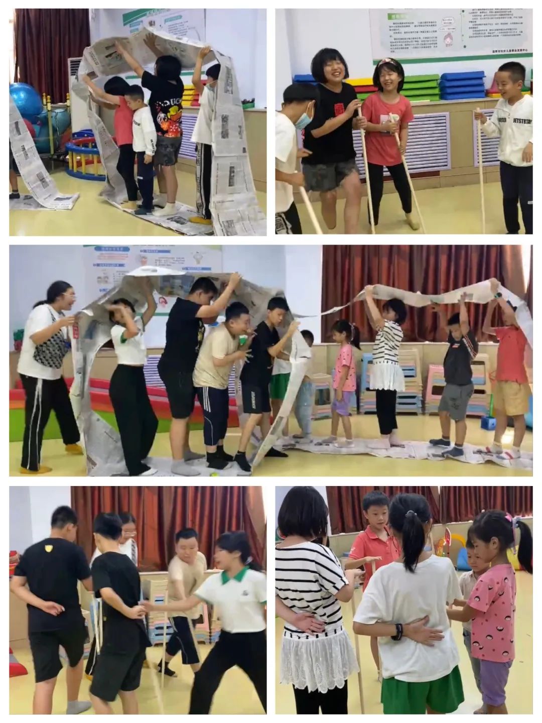 四项心理拓展训练在三楼感统训练室展开,当孩子产生犹豫、害羞、回避等负面情绪时,我们有专业心理老师疏导,在同伴的鼓励和支持下,逐渐克服心理障碍,慢慢的调控好自己的情绪,融入团体。如在“无敌风火轮”一张张易碎报纸如何才能担得起三五个孩子的行走任务、“不倒森林”怎样步调一致整齐划一,是对每个孩子心理素质的考验!停止抱怨,群策群力,最终三个小队都获得成功!