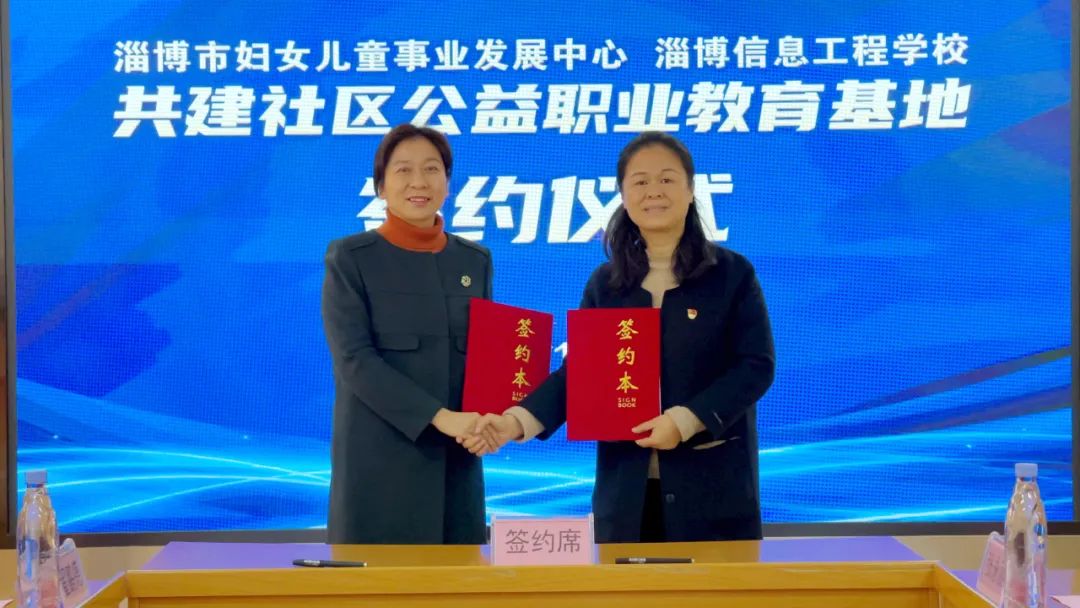 淄博市妇联党组成员、市妇儿中心主任张巍与淄博信息工程学校党总支书记、校长张林丽签订合作意向书