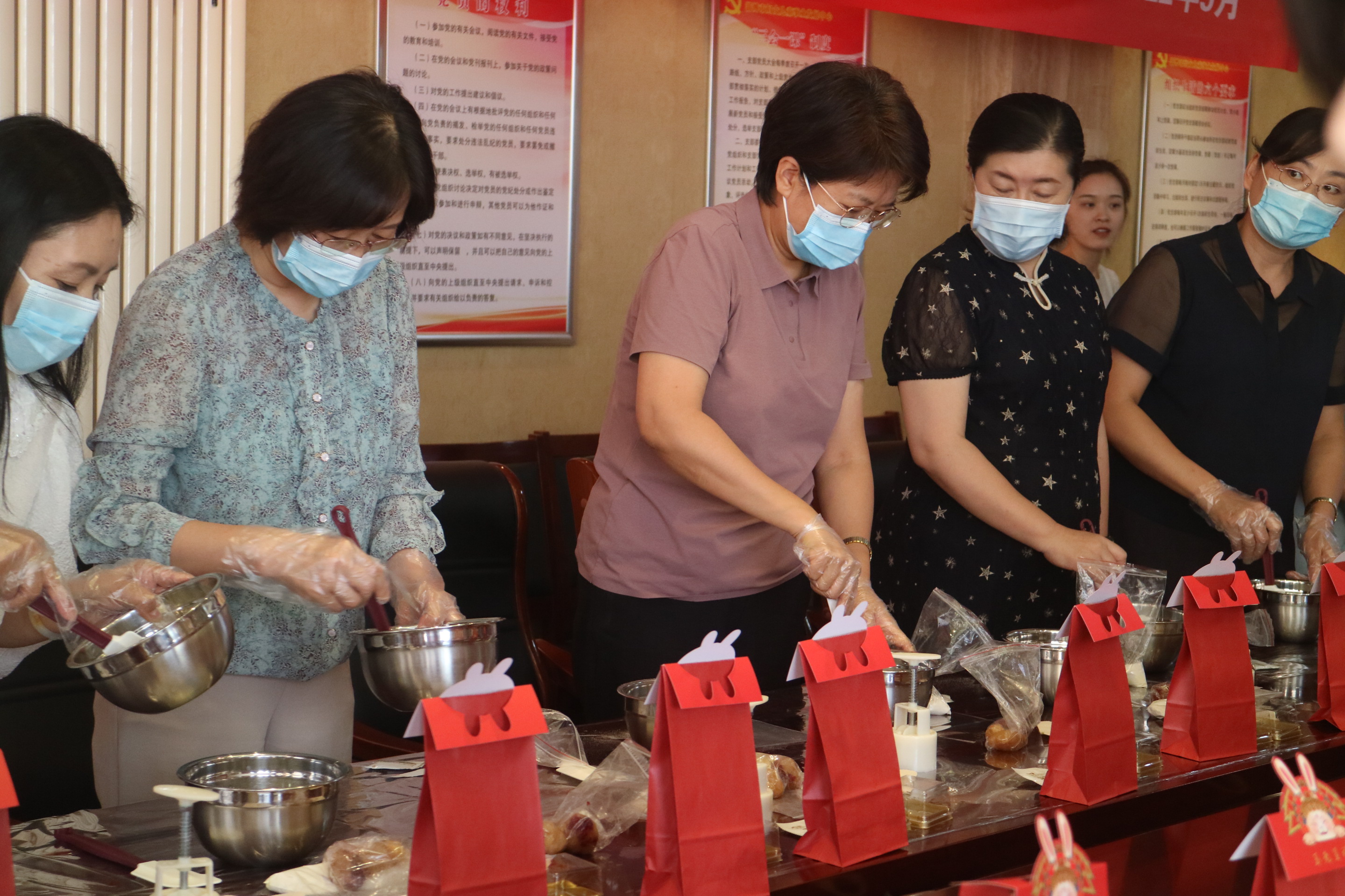 活动现场,烘焙老师详细的为大家讲解了月饼原料的配比、制作方法和注意事项。在老师的指导下,大家兴致盎然、有条不紊地进行揉面、压皮、包馅、印模等工作……相互交流制作的方法和技巧,分享心得体会,一个个承载着美好愿望的月饼很快便跃然盘中。